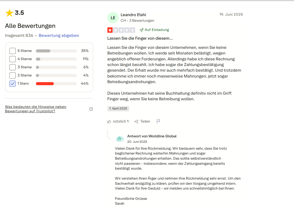 Der erbärmliche unseriöse Versuch von Worldline, die kritische Bewertung zu unterdrücken und ihre korrupten Machenschaften zu verschleiern, ist gescheitert. Trustpilot hat eindeutig entschieden: Kein Verstoss gegen die Richtlinien – die ungeschminkte Wahrheit über die missbräuchliche Betreibungen und Nötigungen liegt für jeden offen.